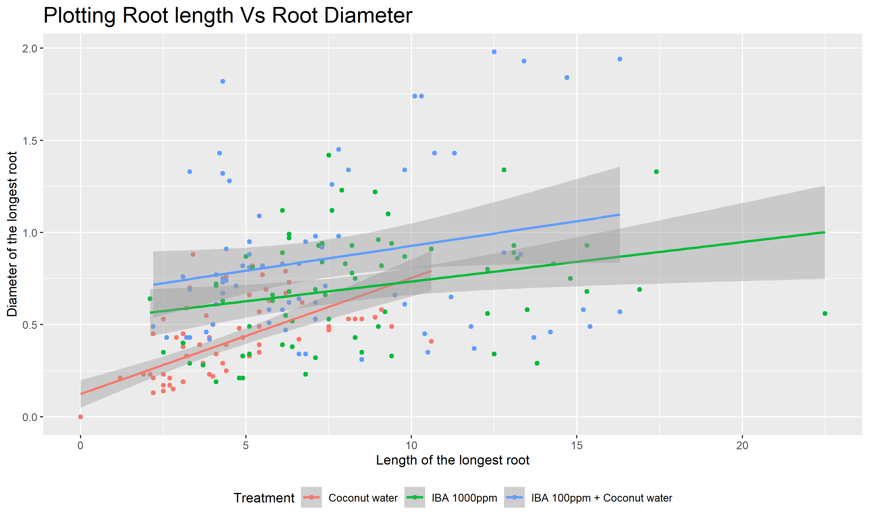 We are going to filter out the control treatment as it is not significant at producing roots at all and plot Figure 2 to find which treatment has better correlation at producing roots with higher diameters.