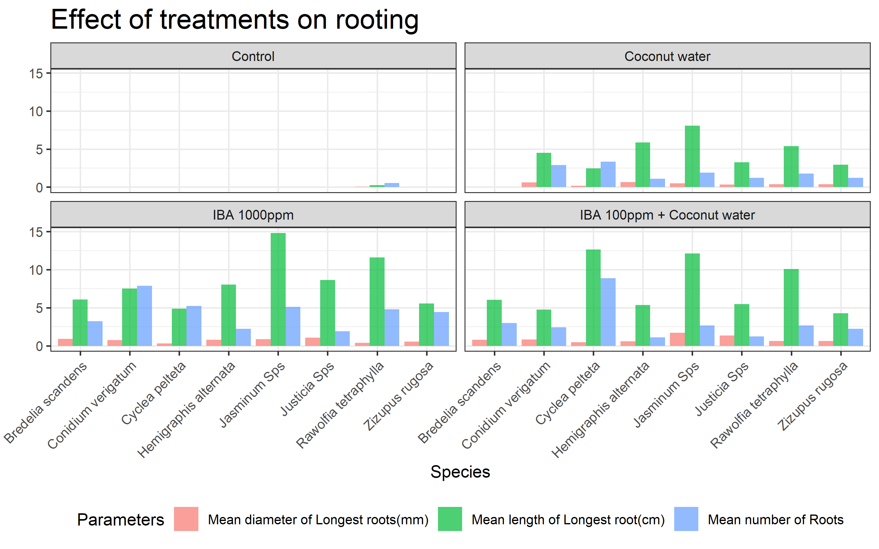 • We can clearly see that Control treatment is not producing any roots in majority of the species.