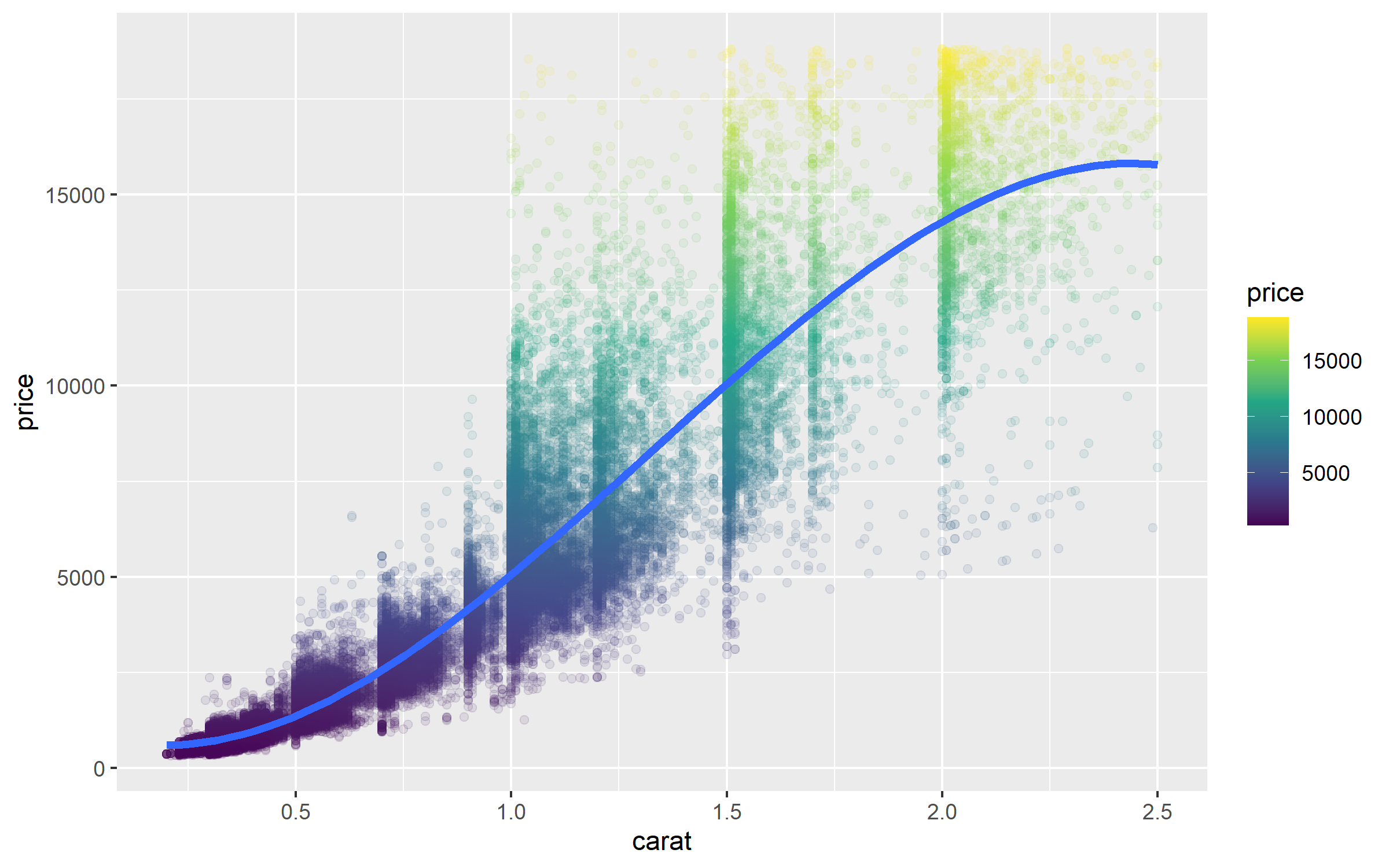 geom_point (alpha = 0.1 , aes (color = price)) +