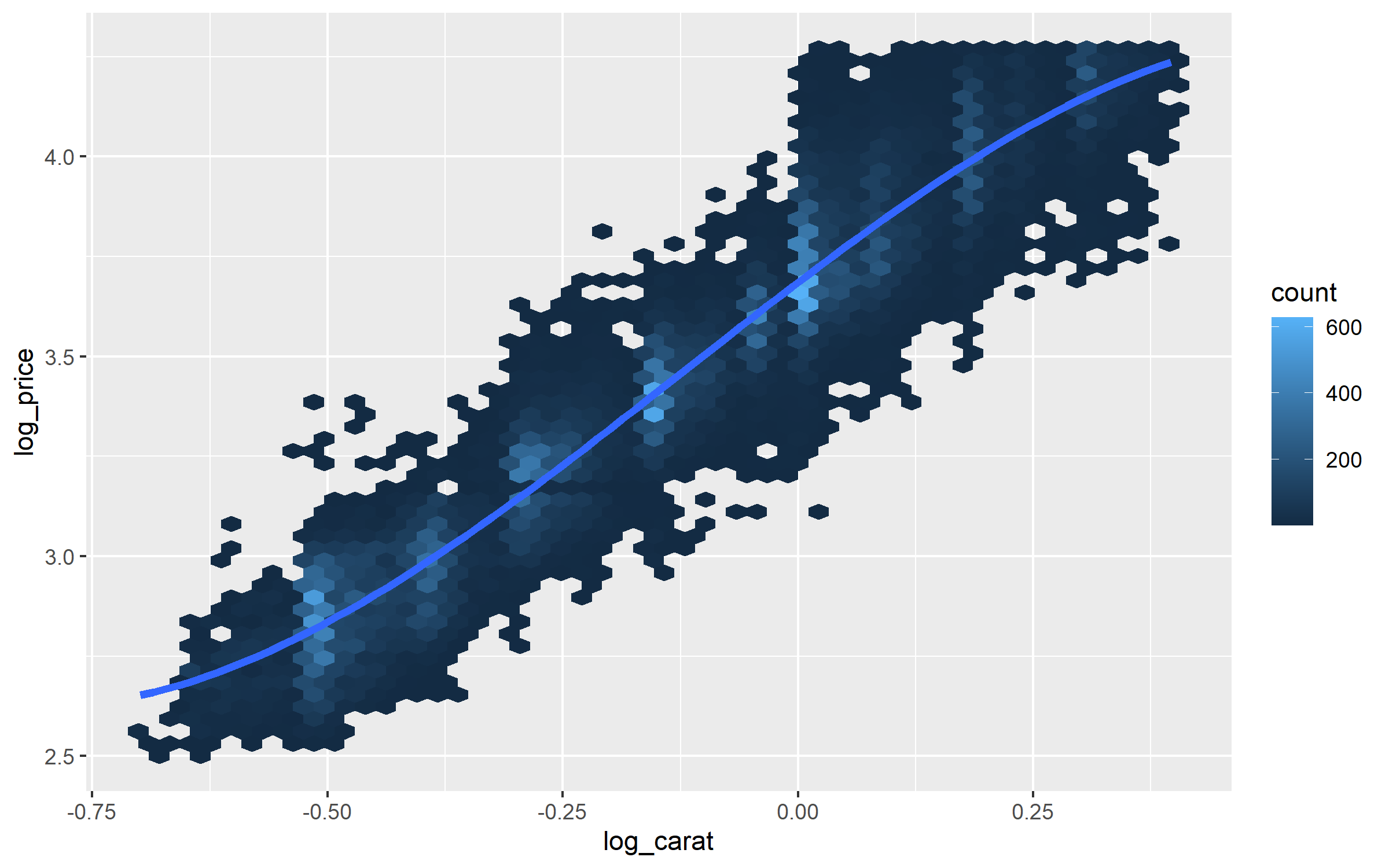 ggplot (aes (log_carat, log_price)) + geom_hex (bins = 50 ) +